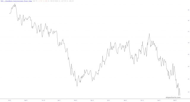 No one can deny that bonds have absolutely stunk up the room for two solid years. Would that equities looked anything like this! Slope would rival Google in terms of traffic! In any case, this is TLT for 24 months solid: