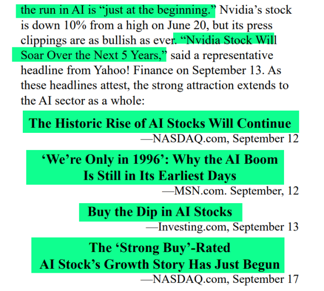 I live in the epicenter of all this madness. My son works for the richest man in the world, and the other night, I strolled by a young man having dinner with his wife, knowing he has a net worth of a fifth of a trillion dollars. These are unprecedented, and quite insane, times we live in, and even at these valuations, what the public is being fed is pablum like this: