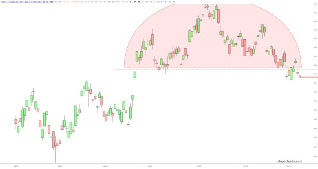 In contrast to all of the above, bonds (by way of TLT below) continue to slip, which I appreciate since I am long June puts and short TLT itself. It isn’t as exciting as precious metals, but I think its movement is every bit as meaningful and important.