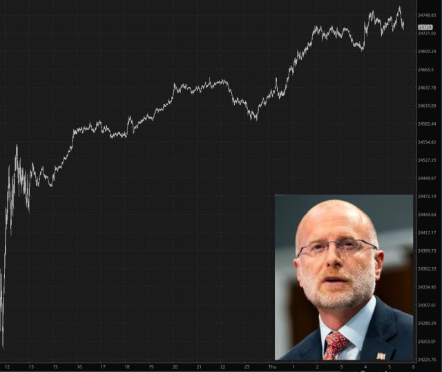 Following yesterday's completely pointless 25 basis point drop in rates, markets around the world continue to rally to lifetime highs. The /NQ, shown below, is once again up triple digits based on nothing more than, well, months of momentum.