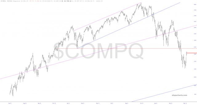The topping patterns on the major indexes are awfully good looking lately. Below, I’ve put forth my best efforts to figure out the appropriate price level where the definitions of the topping patterns go. Newer Slopers, please note that you can almost always click on a given chart to get a big screen-filling version of it.