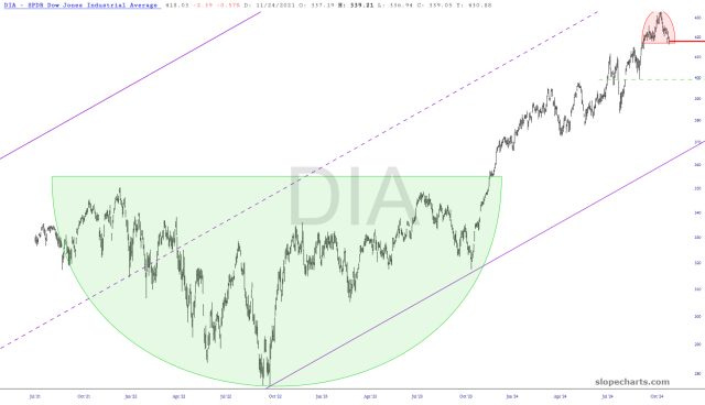 With just hours until election day, let's look at five ETFs which seem to suggest lower equity prices ahead. The first one is the Dow 30 "diamonds", which has completed a top (in pink).