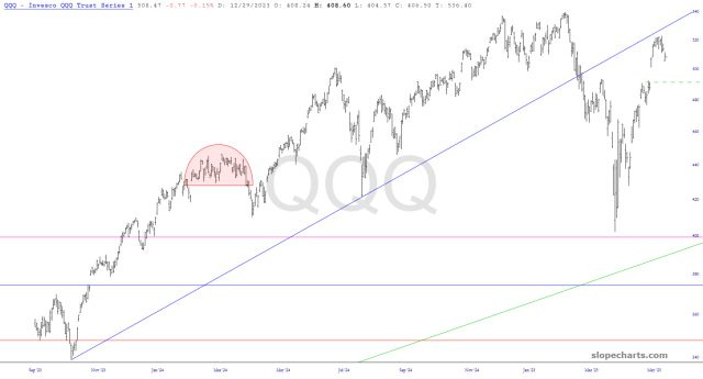 tech stocks raced toward their broken trendline and are now backing off; the big test is whether it can push below the dashed green line (the China surrender gap)
