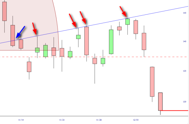 I was really sweating it out last week as AMD, which broke its long term trendline (blue arrow) kept trying repeatedly to get back to the other side of that trendline. As the four arrows show, it failed each time, affirming the crucial nature of this otherwise invisible line. For the past four trading days, it has been coughing up blood.