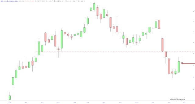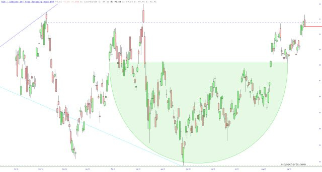 Bonds have had a very good run for months, but having finally closed the price gap, TLT seems to be sputtering out. It’s not exactly shocking: the notion of lending money to the very-much-in-trouble United States of America is losing its appeal. It won’t be long before we’re just like Japan, pathetically being the only buyers of our own debt.