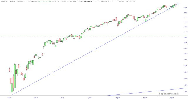Looking at the fresh index charts it seems to me the trendlines are saying, in many cases, “I dare you to break me.“ For example, on the NASDAQ Composite, prices have been assiduously clinging to the trendline, barely hanging on for dear life.