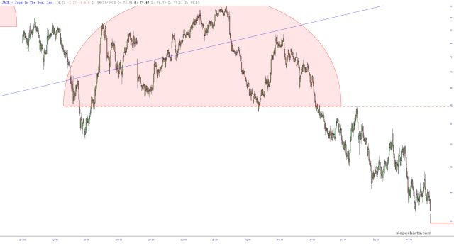 I've got a great pattern success story for you here. On July 30th of last year, I suggested JACK as a short. I missed the exact top by literally about an HOUR. Incredible! In any case, it's lost about 50% of its value. Another victory for SlopeCharts!