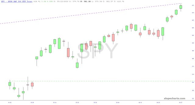 The SPY has blasted higher almost nonstop from April 7th. Indeed, checking x.com, "$SPX" is one of the top trending items, which should tell you just how many shoeshine boys are out there.
