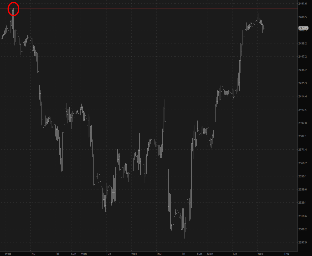 Today should be far more normal for me, now that the madness of Thanksgiving (yep, we did it yesterday) is over. I’m most focused on the small caps (/RTY) which have blasted higher since Friday to almost, I say again, almost capture the last “lower high”. Let’s see if we can manage to re-weaken from here.