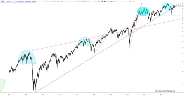 Of my twenty live short positions, a quarter of them are in ETFs. One of them, XLB, is the topic of this post. Symbol XLB is the Material Select Sector fund, and I shorted it Friday at 89.90 with a stop-loss at 91.05. Here's the long-term chart.