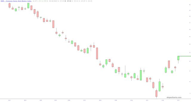 Those DUST shares I bought and sold last week for an overnight 20% profit are looking even better than ever now. Oh, well! This was a crazy trade, but a good one. The trend has totally reversed.