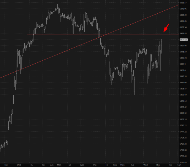 First up are the S&P 500 futures, the /ES. I believe the psychologically important 6,000 level is important, which is just a little above where I've drawn the red horizontal. This represents the base of the topping pattern at the left side of the chart. Should we exceed this, it damages the bear case, and the last meaningful level of resistance is the broken trendline.