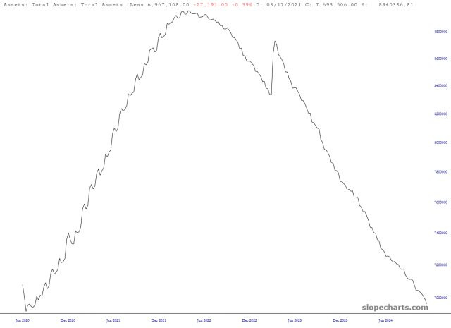 Normalization Bluesthe latest federal reserve data just came outSlope of HopeNov 15, 2024∙ Paid31ShareThe latest Fed liquidity data is in, and it's striking how we've come "full circle" with these multi-trillion dollar government stimulus efforts.Fed Total AssetsContinue reading this post for free, courtesy of Slope of Hope.Claim my free postOr purchase a paid subscription.PreviousNext