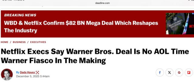 A week ago, I did a post noting that Netflix had broken its lengthy ascending price channel, which should be interpreted as a negative sign. This morning, the huge business news is that the same NFLX has bought Warner Brothers, which led to this curiously defensive declaration by the management: