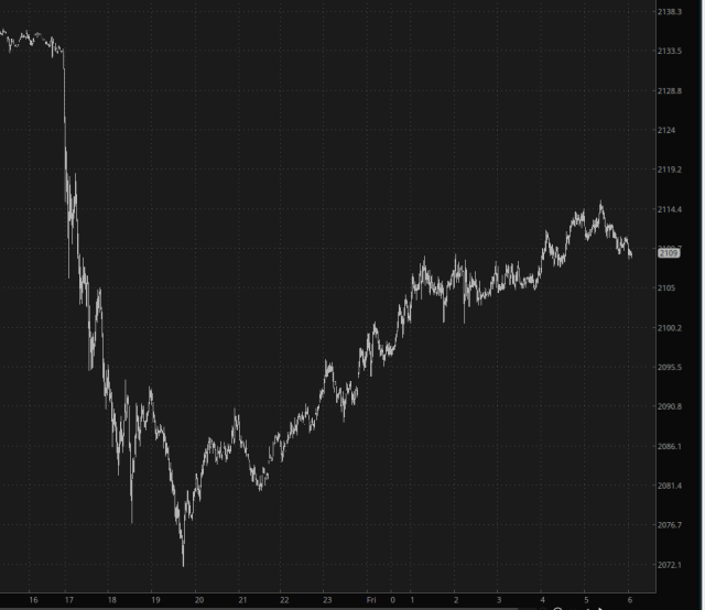 In turn, about half the panic selling in equities has abated as well. Below, for instance, is the /RTY on a minute bar basis. I am thrilled with this, since it's going to give me the opportunity to take my IWM puts position and add even more to it.
