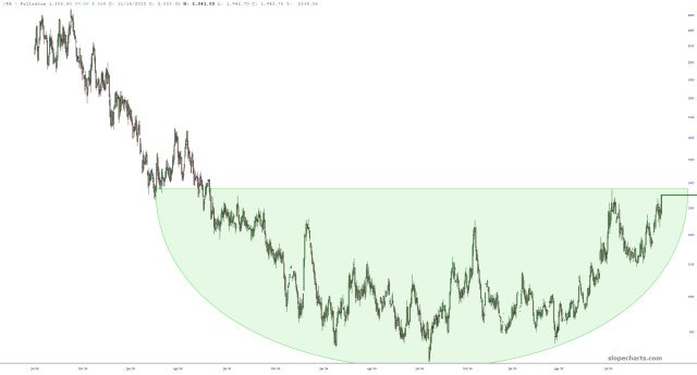 Over the course of Slope’s history, there have been 117 articles (so far!) that included the topic of palladium. In January of this year, I did this simple post which expressed my fondness for the metal. The /PA futures are up about 36% in the nine months since that post.