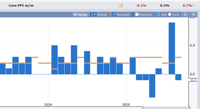 The latest economic data point was the producer price index, which a month ago came in white hot (probably due to tariffs). Today, however, not only was the former number reduced from 0.9% to 0.7%, but the latest report is actually showing deflation, with a 0.1% drop.