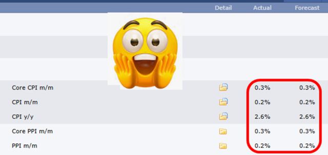 Yesterday morning we got the CPI. This morning, we got the PPI. Every single Forecast was matched to the exact, precise level with the Actual number. Spooky how this government data works, isn't it? Sure is nice to live in a country with almost no inflation! Garsh!