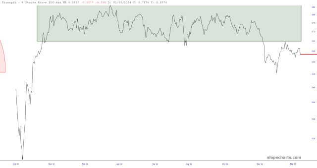 In any case, the chart of the percentage of stocks above their 200-day moving average continues to erode, which is fantastic, broadly speaking.