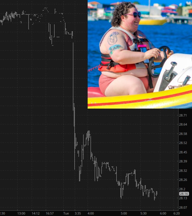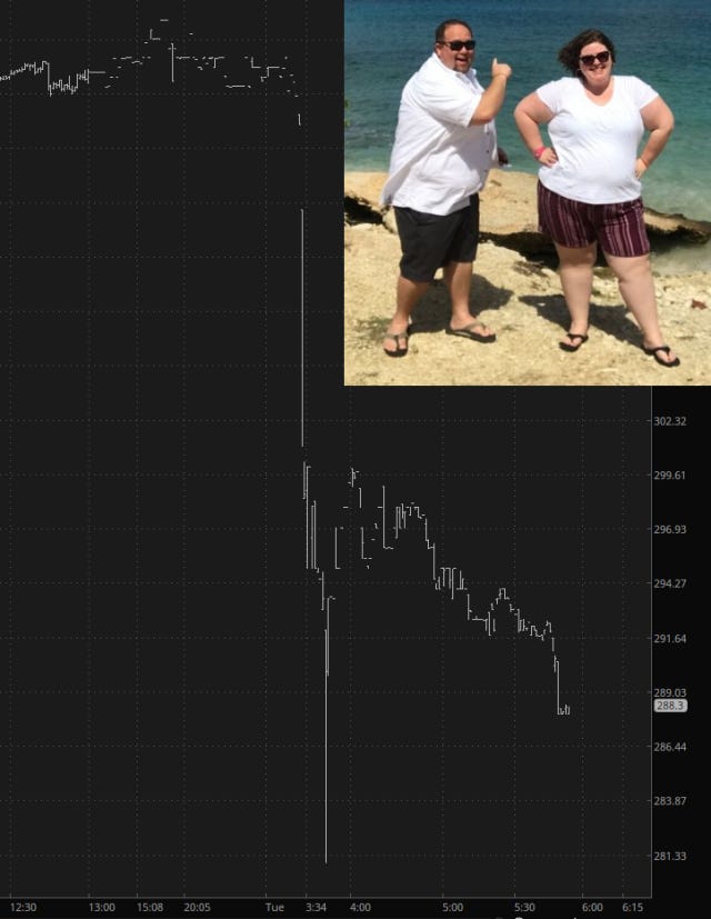 Yesterday, in the midst of bumping up my bearish exposure from 50% to 100%, I shorted two stocks from a sector for which I have ceaseless contempt: cruise companies. I didn’t even realize the bigger one, RCL, was reporting this morning, but it has done so, and with good results for me. Here’s what, umm, “Royal” Caribbean is doing: