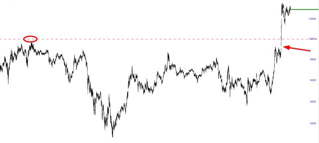 Bitcoin, as surely you must know by now, blasted above $100,000 yesterday evening. It had tried late last month to cross the magical Big Round Number (red oval) but failed to do so rather spectacularly. This time, is strapped on its rocket boosters and ripped thousands of dollars higher within minutes.