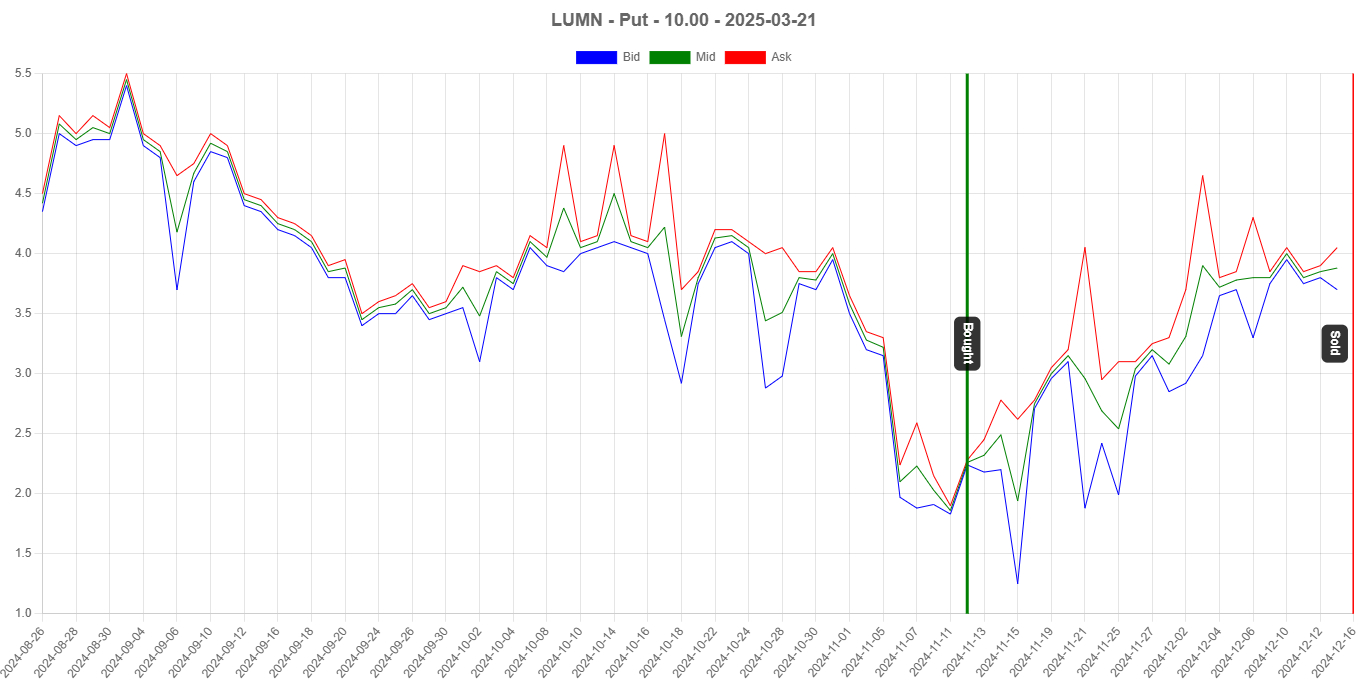 I'm so conservative these days that even March puts (which expire in 95 days) are feeling a bit too close for comfort, so I've taken profits in WING (78% gain) and LUMN (48% gain). I have archived these positions in our Options Chart product.