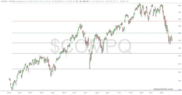 Let's just put on our fantasy caps for a minute and suppose that 1400-point rise on the Dow from Thursday's low to yesterday's high was sufficient to relieve the oversold nature of the market and that, unbeknownst to us, the nature of the market has changed so severely that the selling has already resumed. With those rosy glasses on our heads, let's talk about how each of these indexes might continue to get walloped.