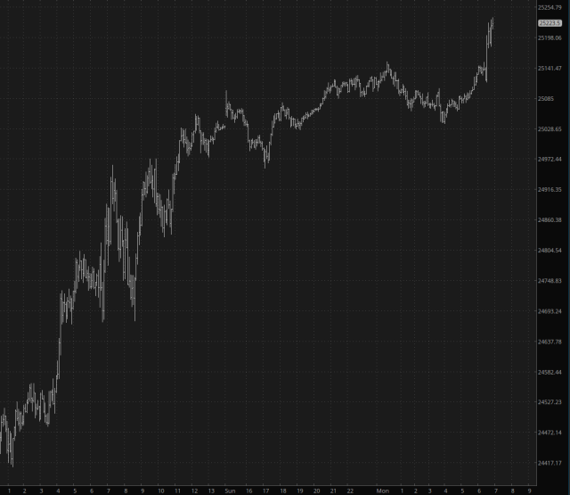 The stock market is like a bomb waiting to go off that never does. Or a messiah that never comes. Take your pick. The /NQ, in that spirit, has done nothing but climb since midnight on Thursday. The only hope for the bears at this point is a string of earnings shocks. I wouldn’t hold your breath.