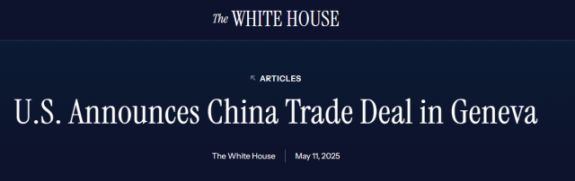If one bothers to read past the headline, however, and if you know how to read between the lines of this kind of puffery, it soon becomes clear that of course there's no deal (Bessent himself already said such a thing would take literally years to really hammer out) but just a general understanding that they'll keep talking and won't try to kill each other in the meanwhile.