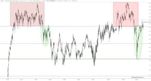 The meandering Russell 2000 is continuing to drive me bonkers, but I wanted to offer myself, and you, a bit of longer-term perspective. Here is the kind of activity I've been tracking on the /RTY, with the salient portions highlighted.