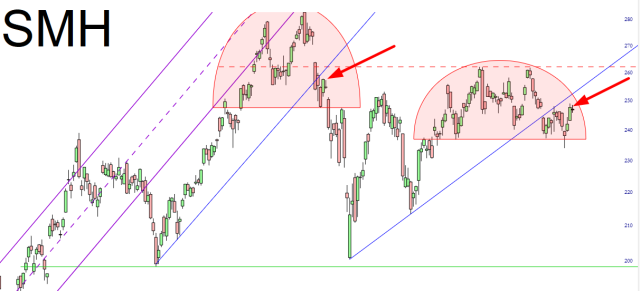 The semiconductor sector has enjoyed a counter-trend rally for a few days, but my conclusion is that the broken trendline, as before, represents an important reversal point for this sector.