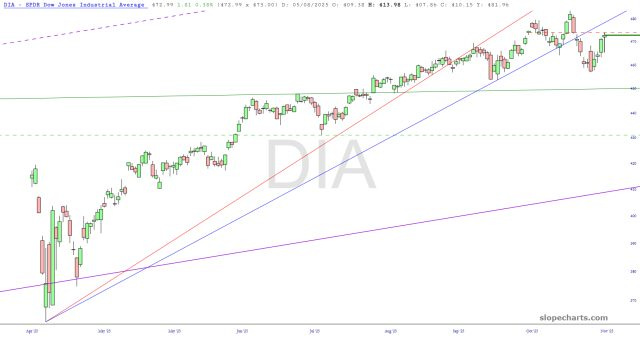 Following last Thursday’s tumble, there have been four powerful up days in a row. As such, prices are approaching the underbellies of their broken trendlines, but they have NOT pierced them, so we still remain bearishly configured (paradoxical as that seems).