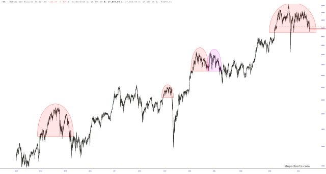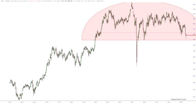 While thumbing through long-term futures, the chart of the Nikkei caught my eye, since it seems like a very well-formed and quite gargantuan top.