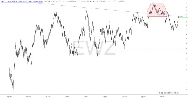 Preface to both posts: on Friday evening, I went through my list of key ETFs, and I found eight that seemed strong and eight that seemed vulnerable to weakness. Here are the vulnerable-looking ones, in alphabetical order of their symbols: