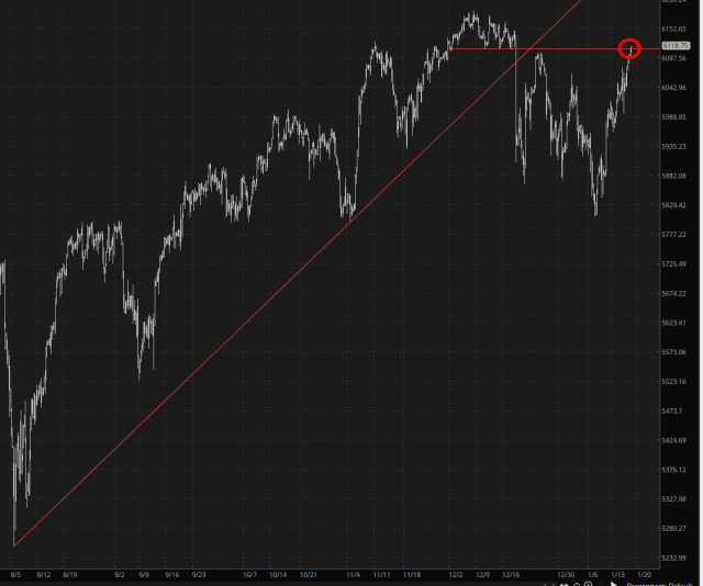 Indeed, just about the only red right now is the small caps, /RTY. We have tagged the same important resistance level which has acted as a jump-rope …